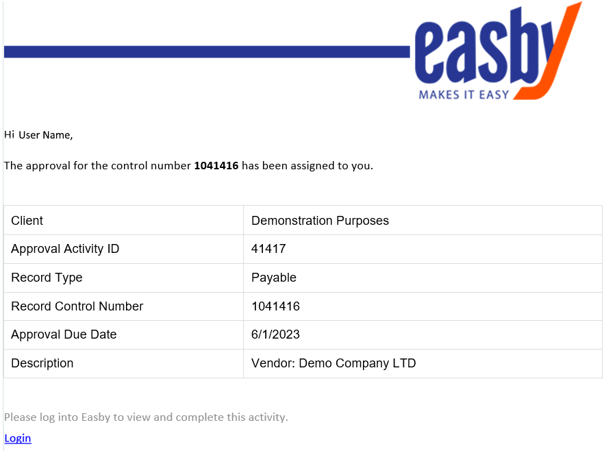 Upon approval assignment, users will receive an email notification confirming that an approval is pending action. Easby will also generate system reminders of overdue approvals from time-to-time.