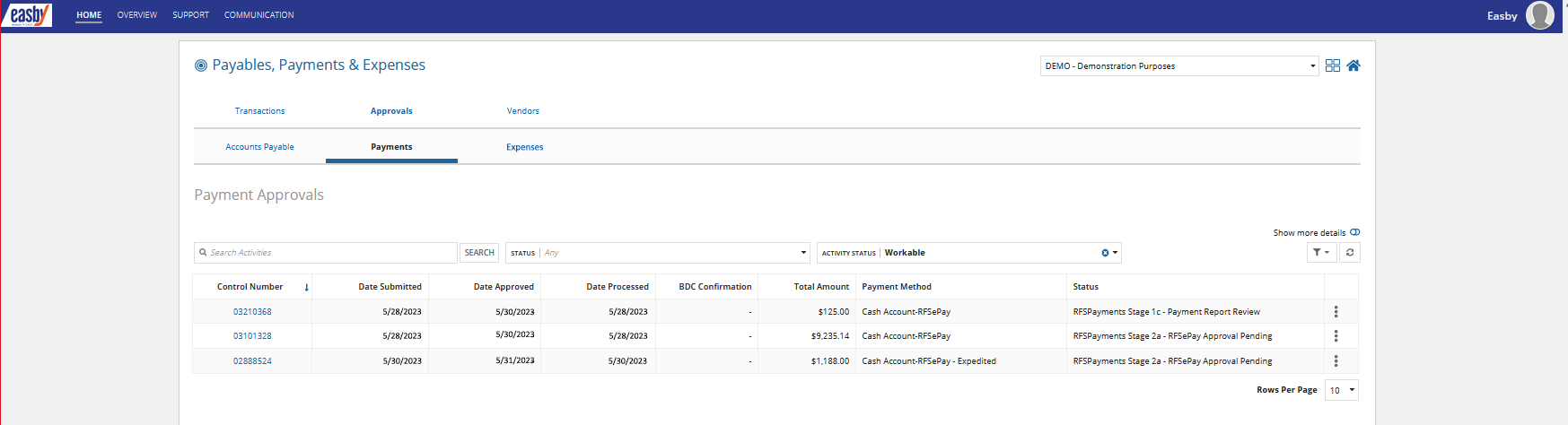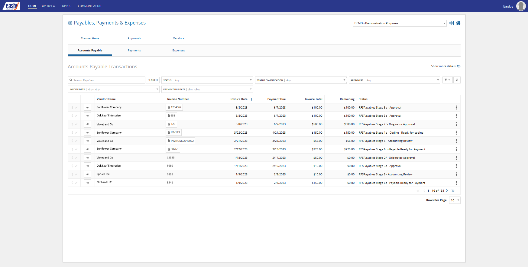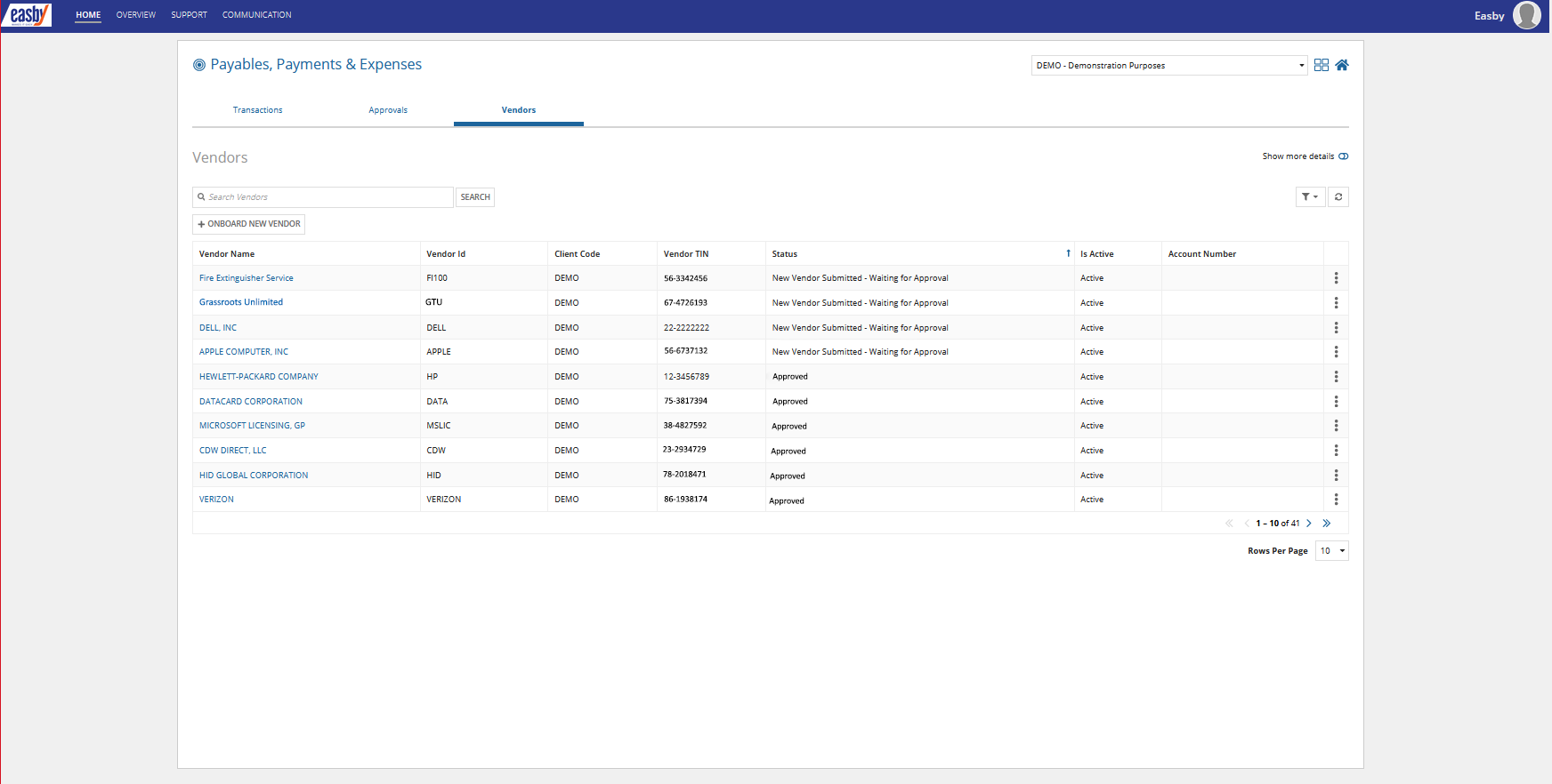 Easby's “Vendors” section allows users to view and manage vendors. This includes details such as vendor names, IDs, status, and W-9 information.