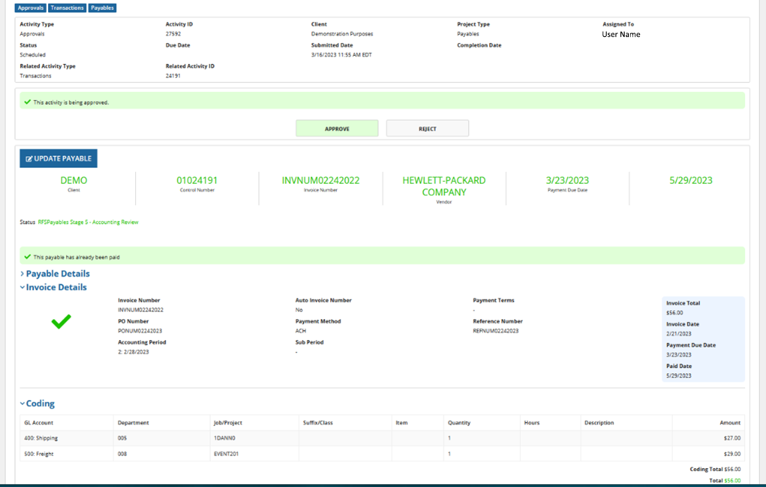 Your role is to approve or reject with comment. Below is a sample view of “inside” a payable record where “Approve” has been selected.